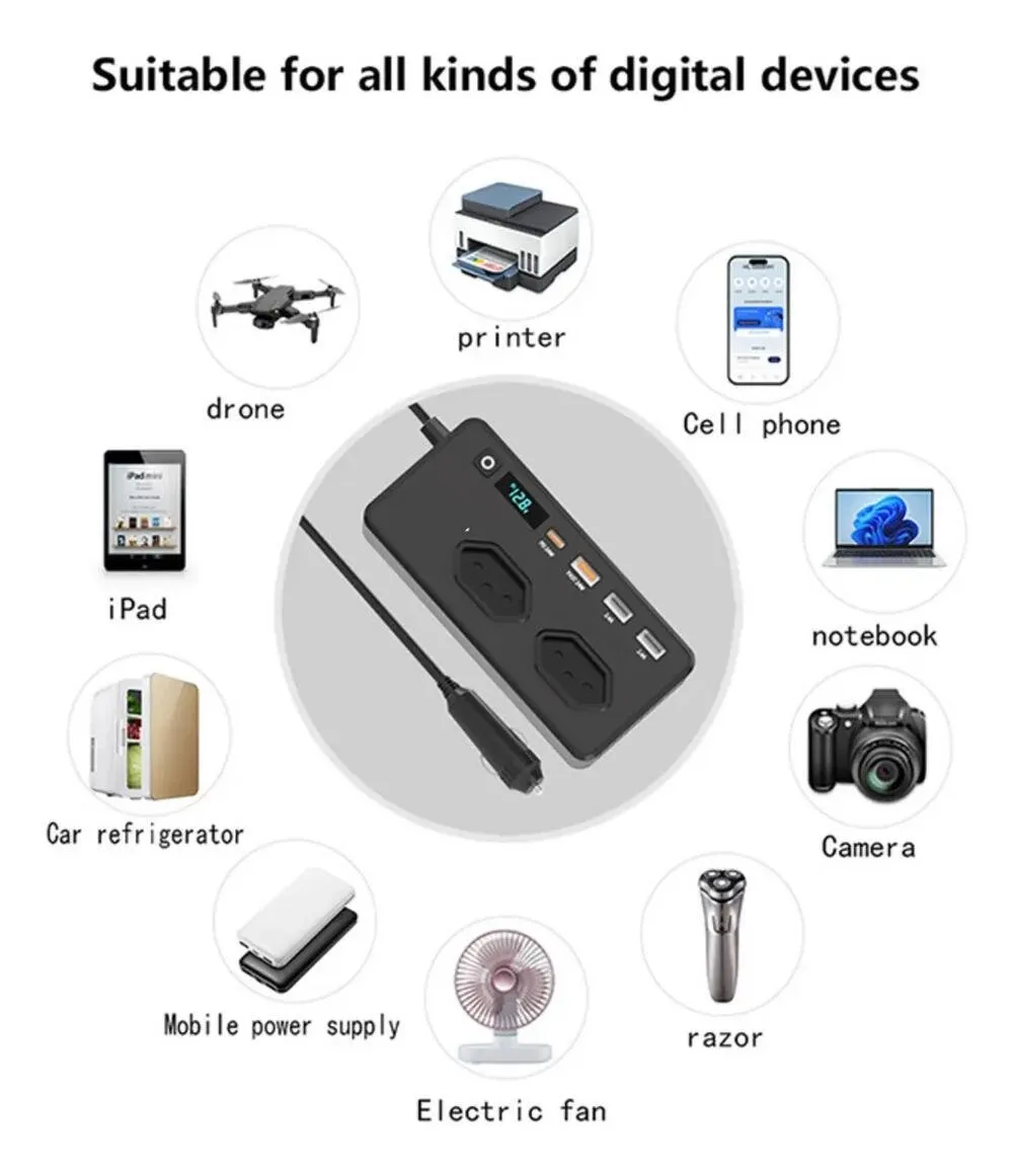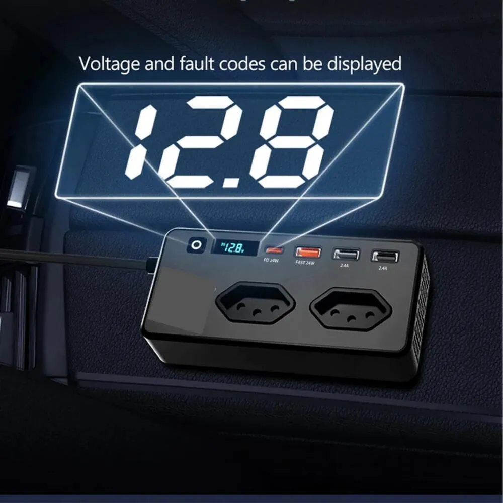 INVERSOR AUTOMOTIVO VEICULAR CONVERSOR ELETRICO 12V PARA 127V COM 2 TOMADAS 3 USB 1 TIPO-C